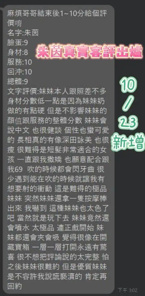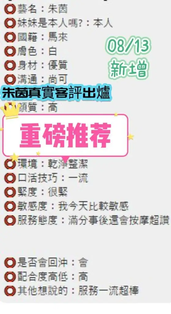 可配合 : 奶砲,按摩,69,共浴,LG(舌吻)依氣氛衛生而定,可親嘴,無套吹,口爆,品鮑,舔蛋,奶推,屁推,冰火,絲襪,玩具(按摩棒),玩具(跳蛋),自慰秀,快餐,2S